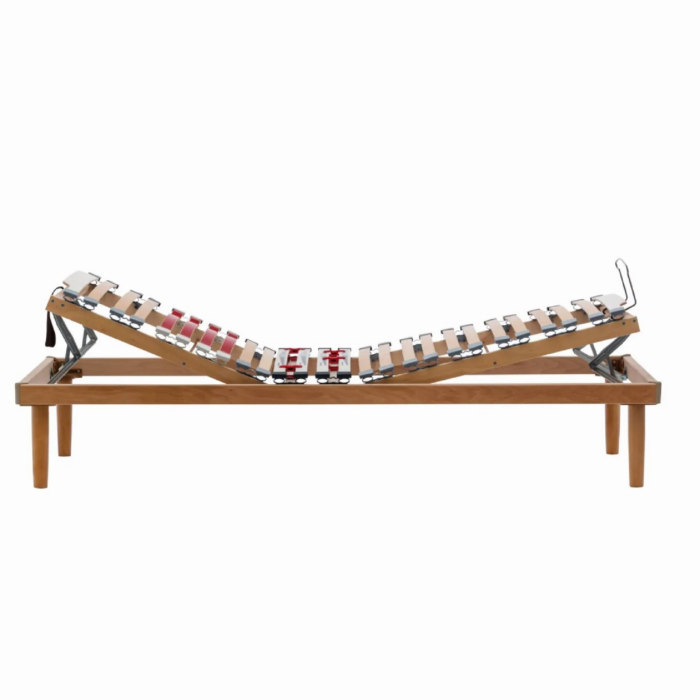Il meccanismo di movimento manuale consente di sollevare zona testa/spalle e zona gambe, per personalizzare al massimo le posizioni di riposo. Nella versione matrimoniale le alzate sono separate, quindi ognuno può regolare a proprio piacimento la sua parte di letto, è pertanto consigliato abbinare due materassi singoli.
