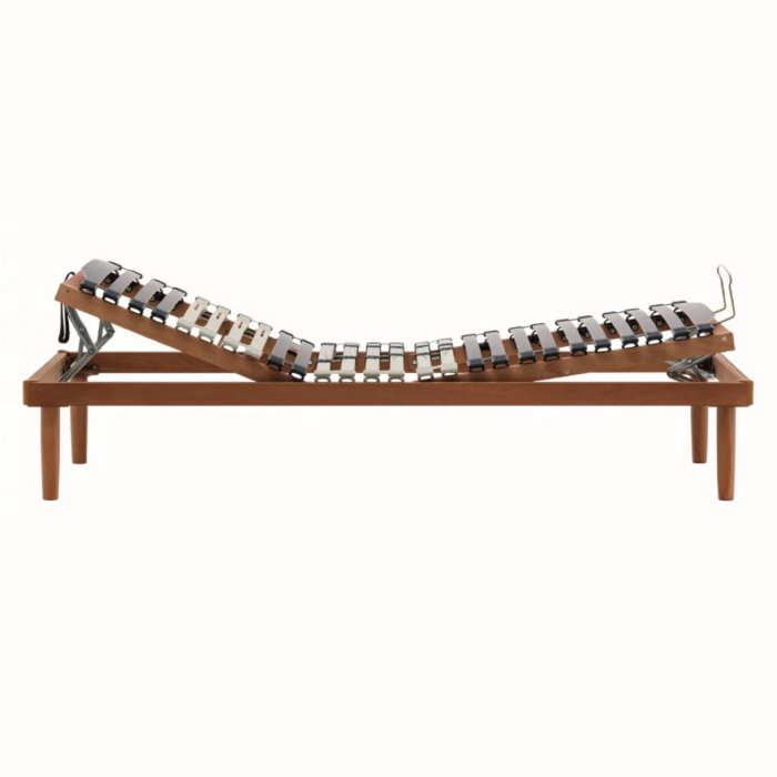 Il meccanismo di movimento manuale consente di sollevare zona testa/spalle e zona gambe, per personalizzare al massimo le posizioni di riposo. Nella versione matrimoniale le alzate sono separate, quindi ognuno può regolare a proprio piacimento la sua parte di letto, è pertanto consigliato abbinare due materassi singoli.