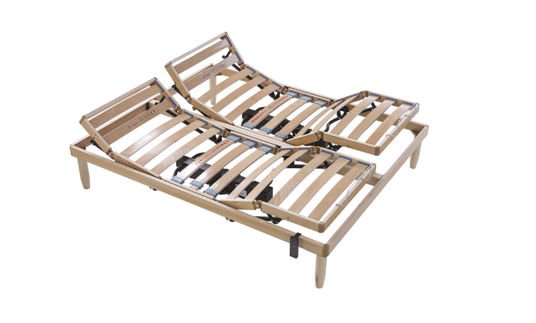 Rete con doppia struttura per consentire il movimento di testa/piedi. Il meccanismo di sollevamento di testiera e pediera a motore consente di regolare la posizione di relax stando comodamente distesi, grazie al pratico telecomando.