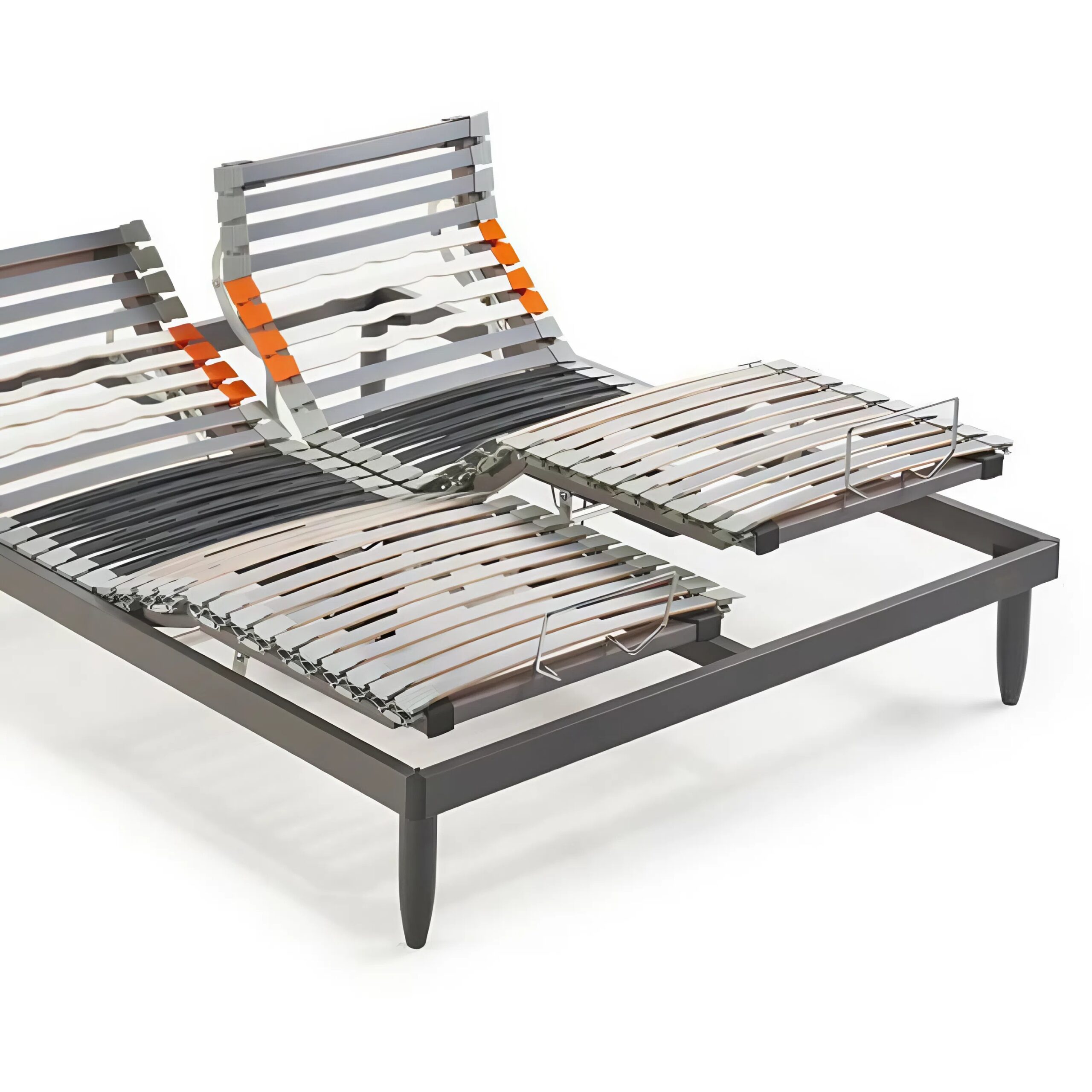 Il meccanismo di movimento a motore consente di regolare, grazie al pratico telecomando, l’inclinazione di testata e pediera per personalizzare la posizione di riposo. Se la rete supera la larghezza di 120 cm, la doga viene divisa in parti uguali dal telaio della rete. Per questo motivo per la versione matrimoniale si consiglia di abbinare due materassi singoli, proprio per garantire indipendenza e libertà nei movimenti.