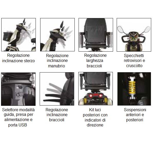 Completo di kit luci con indicatori di direzione, specchietti retrovisori, cestino portaoggetti anteriore, paraurti, ruotine antiribaltamento. Cruscotto comandi multifunzione. Realizzato in struttura di acciaio con carenatura in ABS. Dotato di sospensioni anteriori e posteriori.