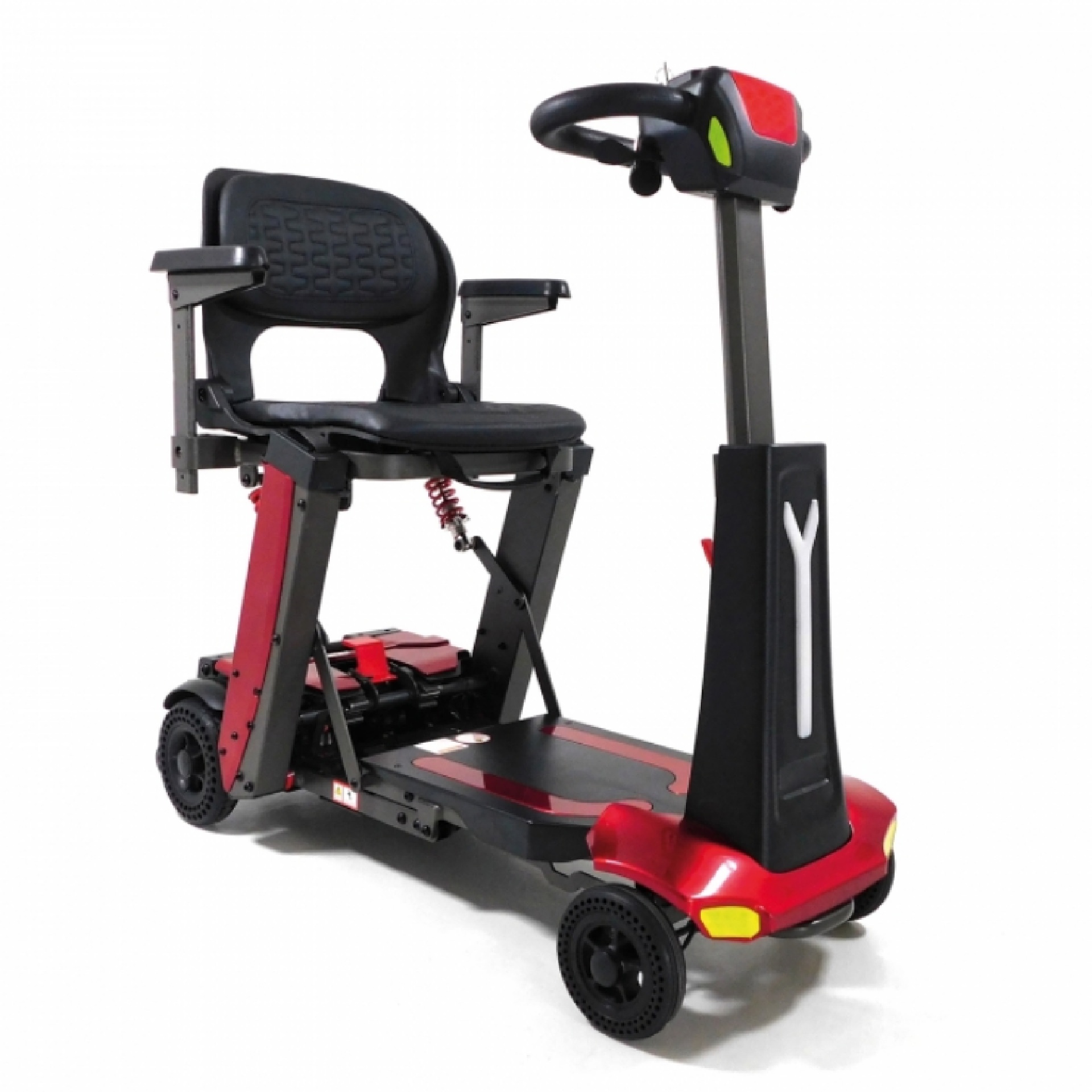 SMARTY E è uno scooter elettrico a 4 ruote di piccole dimensioni, pieghevole con telecomando e smontabile. La facile manovrabilità e le sue caratteristiche di telaio, lo rendono adatto ad un utilizzo in ambienti interni con spazi ridotti e percorsi esterni pianeggianti. Le regolazioni in inclinazione ed altezza del manubrio, unite ai due ammortizzatori posti sotto il sedile, permettono di adattarlo con facilità alle proprie esigenze ed ottenere un miglior confort di guida. Lo schienale è ribaltabile in avanti ed i braccioli sono ribaltabili e regolabili in altezza. Sulla consolle del manubrio si trovano: uno schermo LED, pulsanti e leve, per attivare e visionare le diverse funzionalità dello scooter e l’indicatore di carica della batteria. La dotazione comprende un faro a LED anteriore, una pratica sacca laterale, uno zainetto posteriore, un porta-bastone ed un telecomando per attivare la funzione di piegatura a distanza. Il telaio completamente pieghevole e smontabile, senza l’utilizzo di attrezzi, lo rende facilmente trasportabile.
