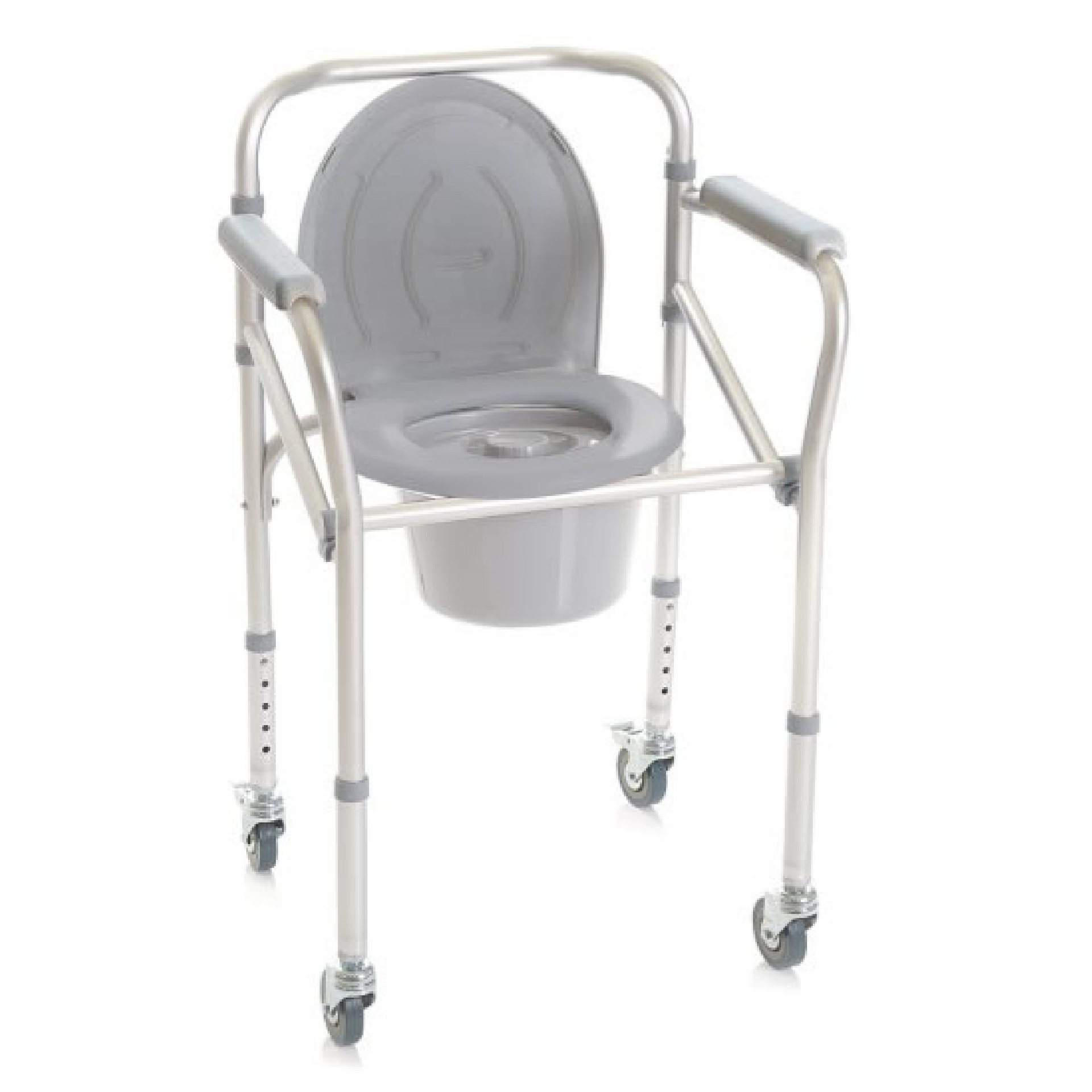 Sedia comoda pieghevole con ruote. Struttura in acciaio verniciato con seduta in polietilene ad alta densità, secchio e braccioli in plastica.