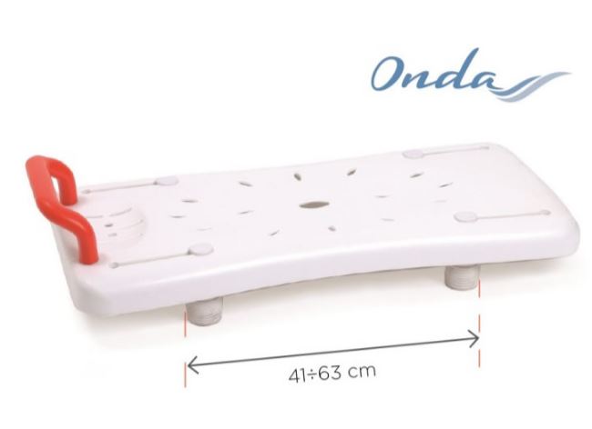 Sedile per vasca in plastica antiscivolo con maniglia e fori per il passaggio dell’acqua.