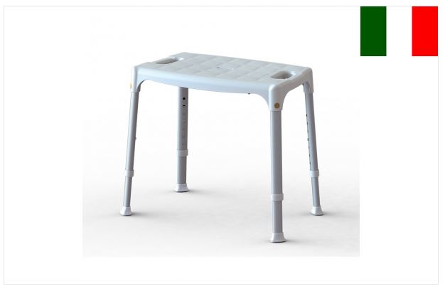 Sgabello per doccia di design moderno e accattivante, con gambe in alluminio anodizzato ad altezza regolabile, seduta in polipropilene e fibra di vetro ergonomica con impugnature laterali e scarichi per il deflusso dell’acqua, dotata in configurazione base: