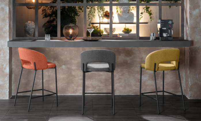 sgabello di tessuto imbottito, presenta uno schienale circolare che garantisce una struttura che abbraccia la forma del corpo, ideale per rilassarsi in un aperitivo in compagnia.