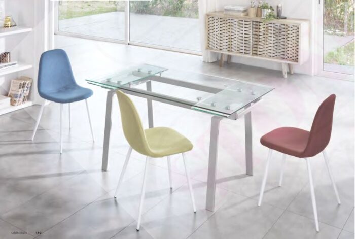 Tavolo da pranzo allungabile con base in metallo e top in vetro trasparente.