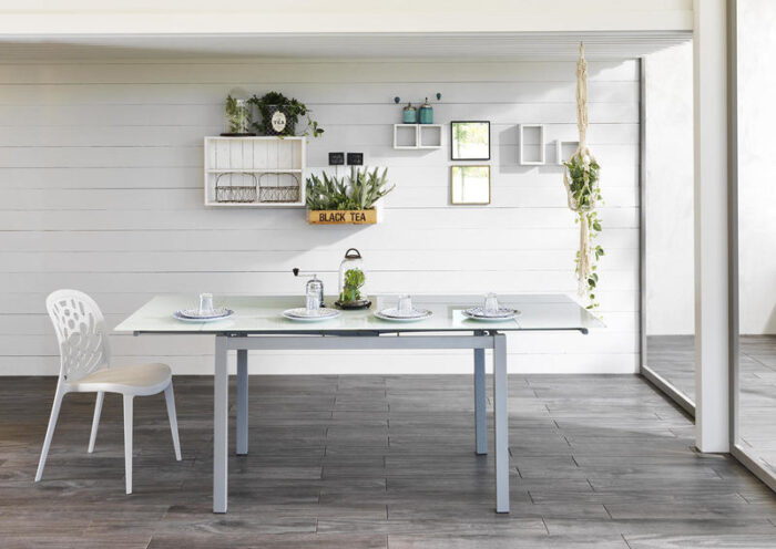 Tavolo da pranzo allungabile con 2 allunghe, basamento in metallo verniciato e Top in vetro temperato.