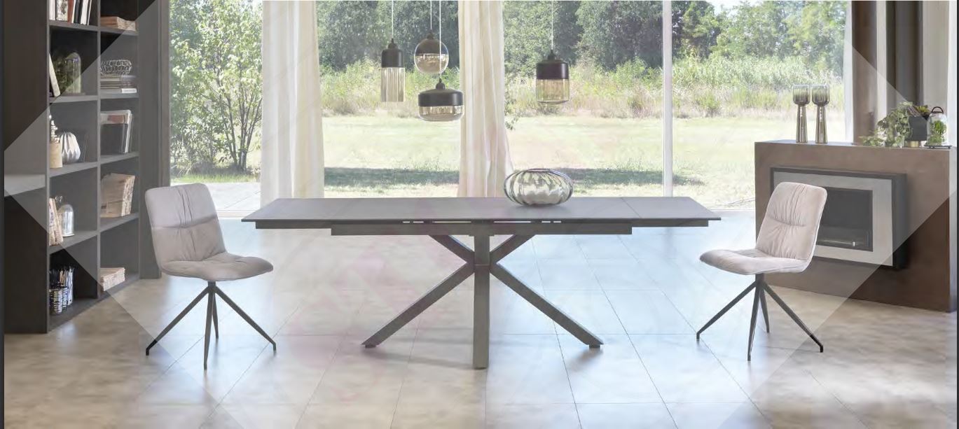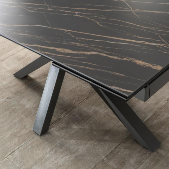 Tavolo da pranzo modello Ceramica Uno Stones con base in metallo verniciato opaco e Top in vetro e ceramica, dotato di 2 allunghe in ceramica su vetro.