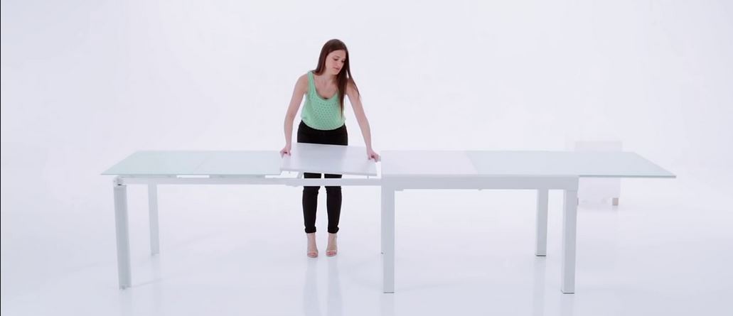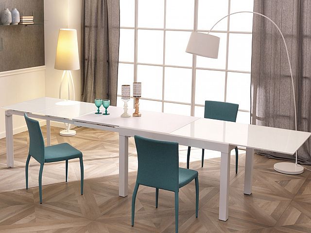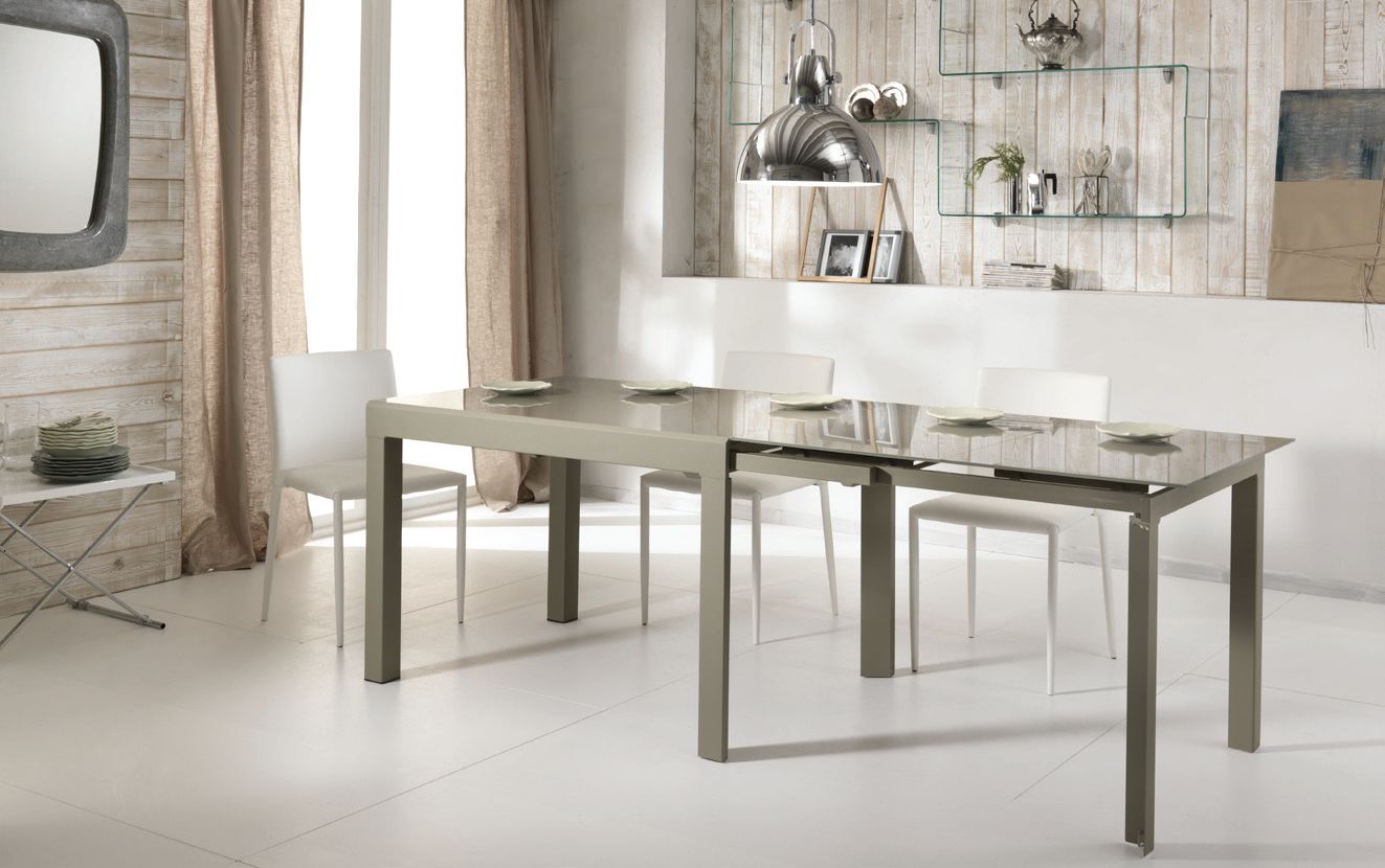 Tavolo da pranzo modello Executive Stones con base in metallo verniciato opaco e Top in vetro temperato, dotato di 2 allunghe in vetro temperato e due allunghe in mdf verniciato. Due allunghe misurano 50 cm, le altre due 60 cm. Allungabile fino a 3,5 m.
