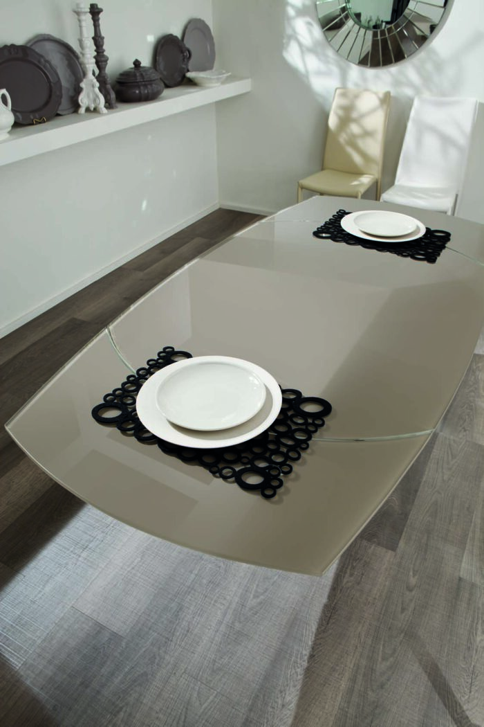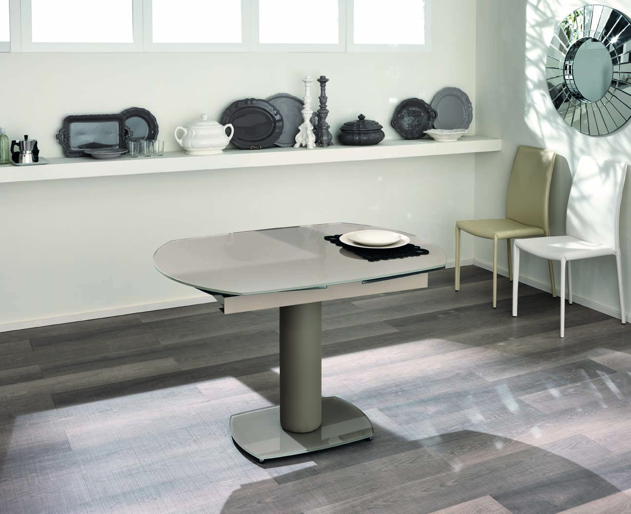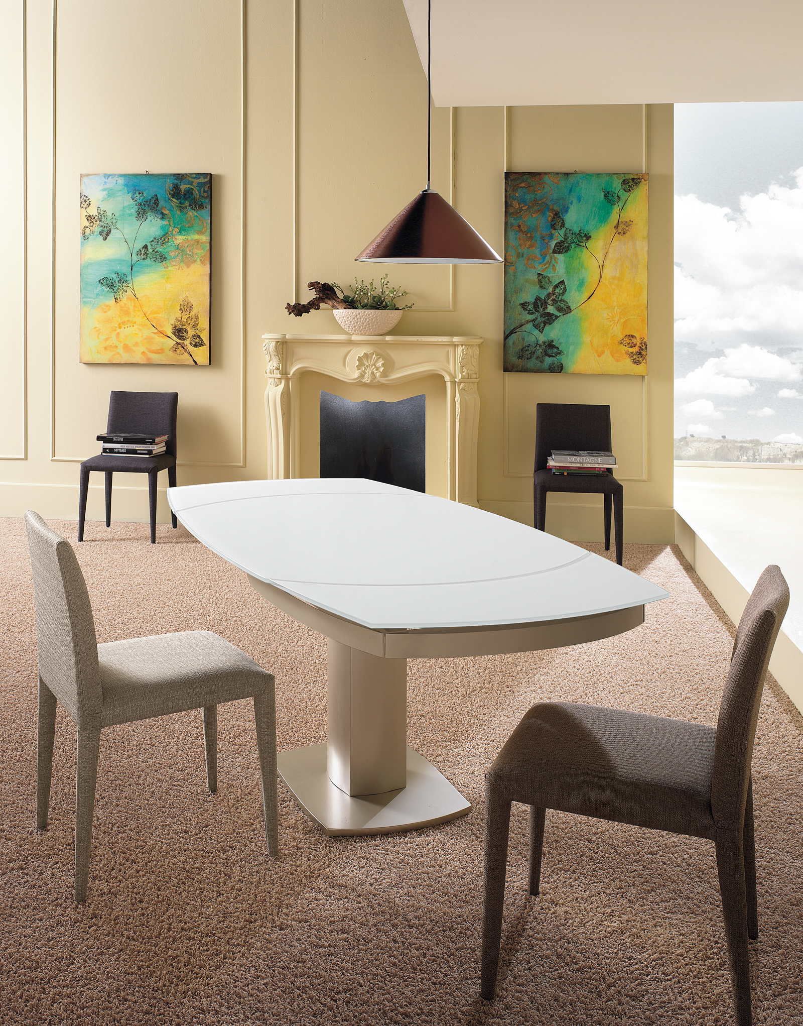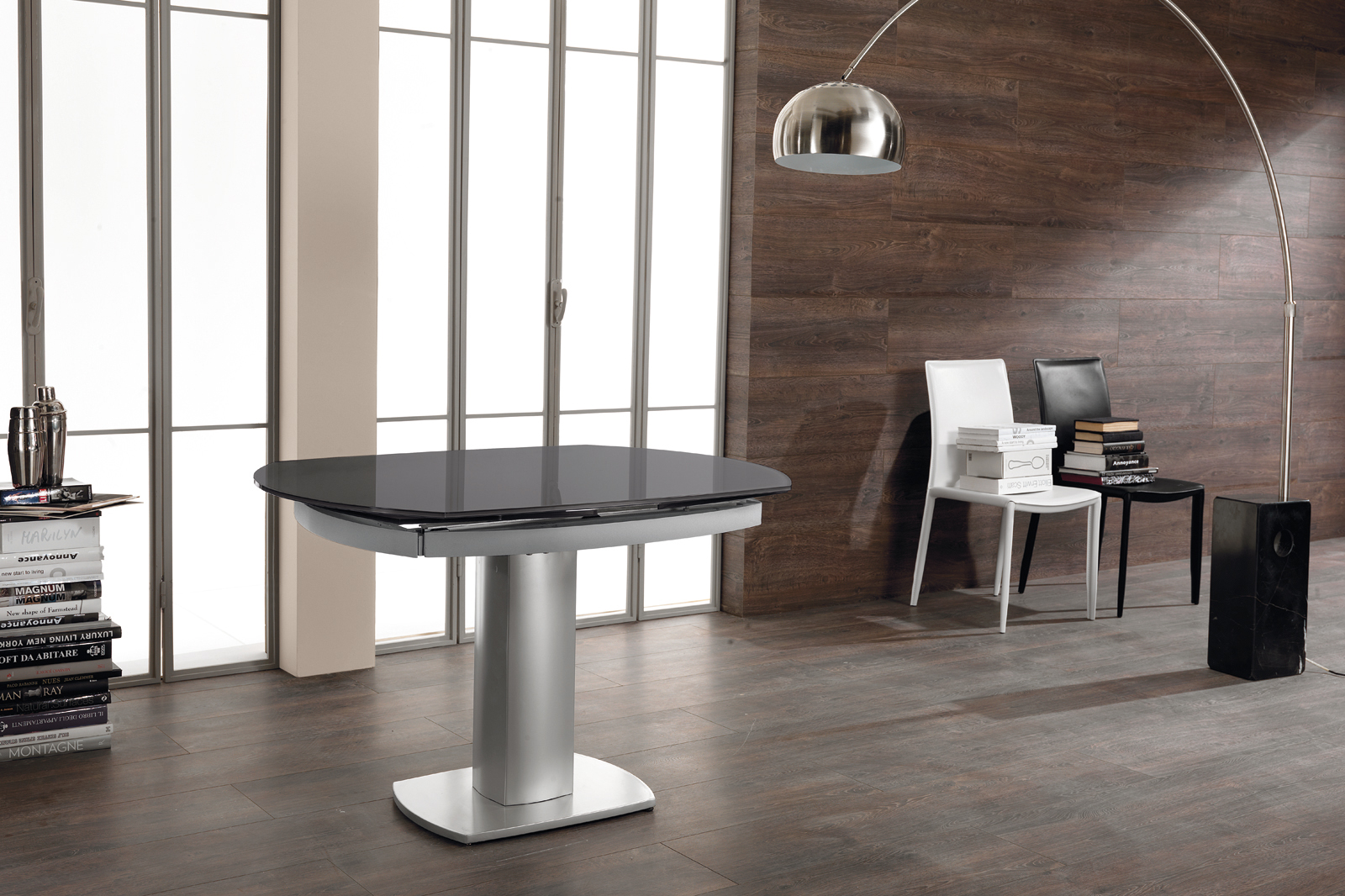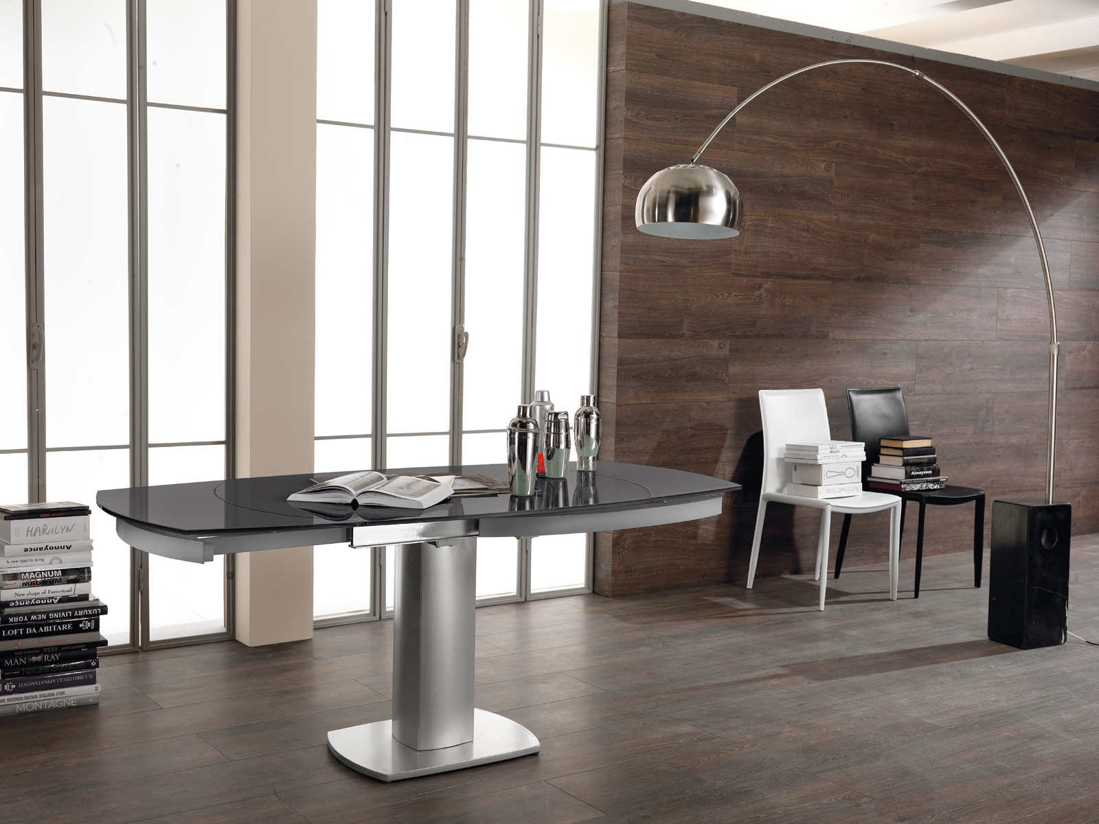 Tavolo da pranzo allungabile con base in metallo verniciato color nikel e top in vetro temperato.