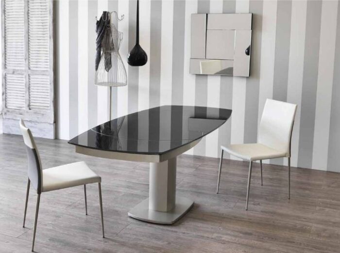 Tavolo allungabile con base in metallo e top in vetro.