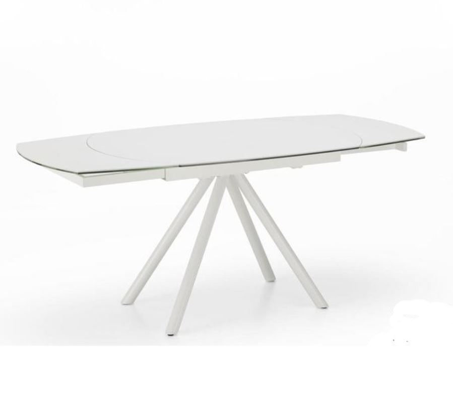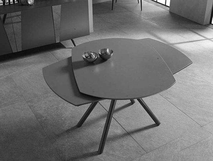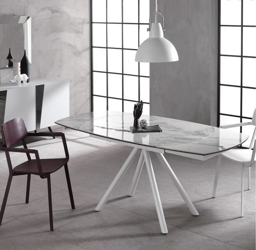Tavolo allungabile con base in metallo verniciato e top in ceramica.