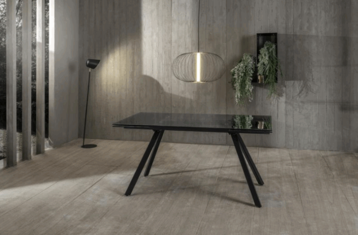 Tavolo allungabile con top in vetro fumè.
