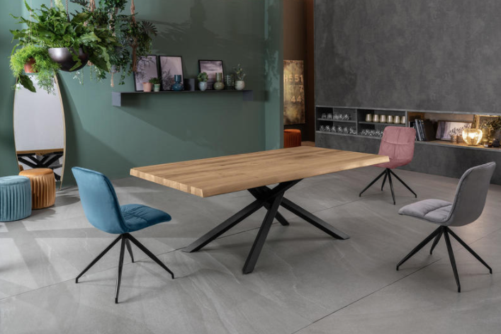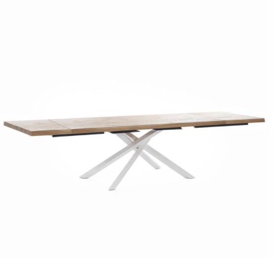 Tavolo allungabile con top in rovere impiallacciato e bordo massellato, gambe in metallo verniciato.