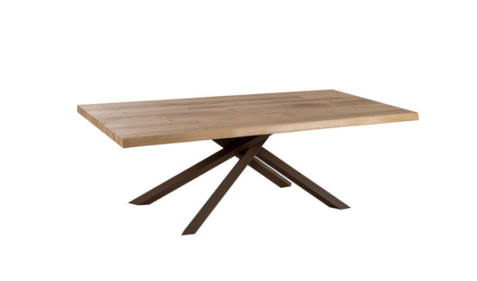 Tavolo con top in rovere impiallacciato e gambe in metallo.