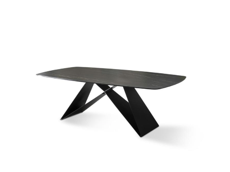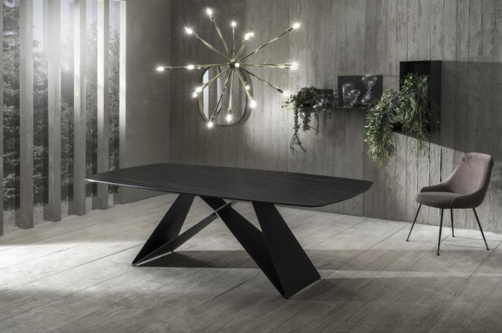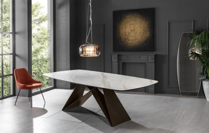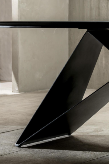 Tavolo con top in ceramica su vetro e basamento in metallo verniciato.
