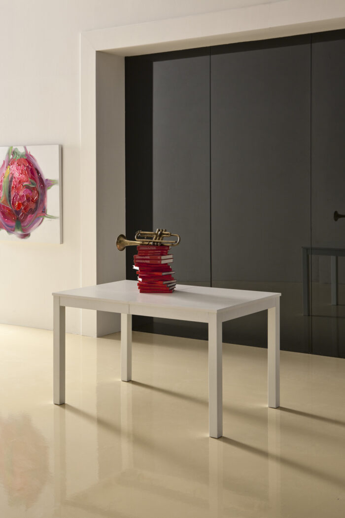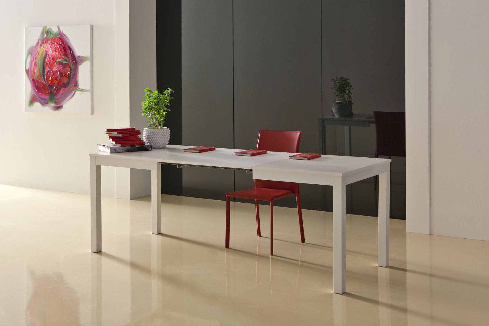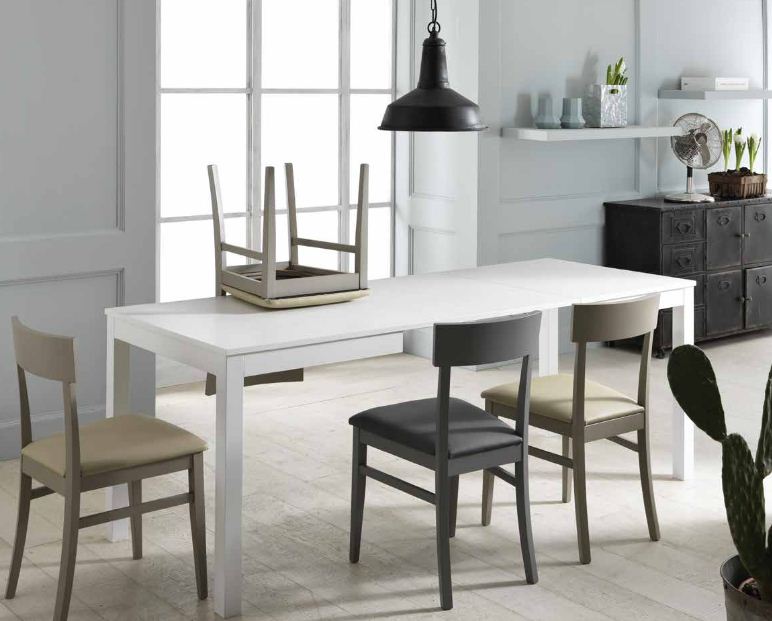 Tavolo da pranzo con base in legno di faggio massello, Top e fasce in melaminico con due allunghe da 40 cm, sempre in melaminico.