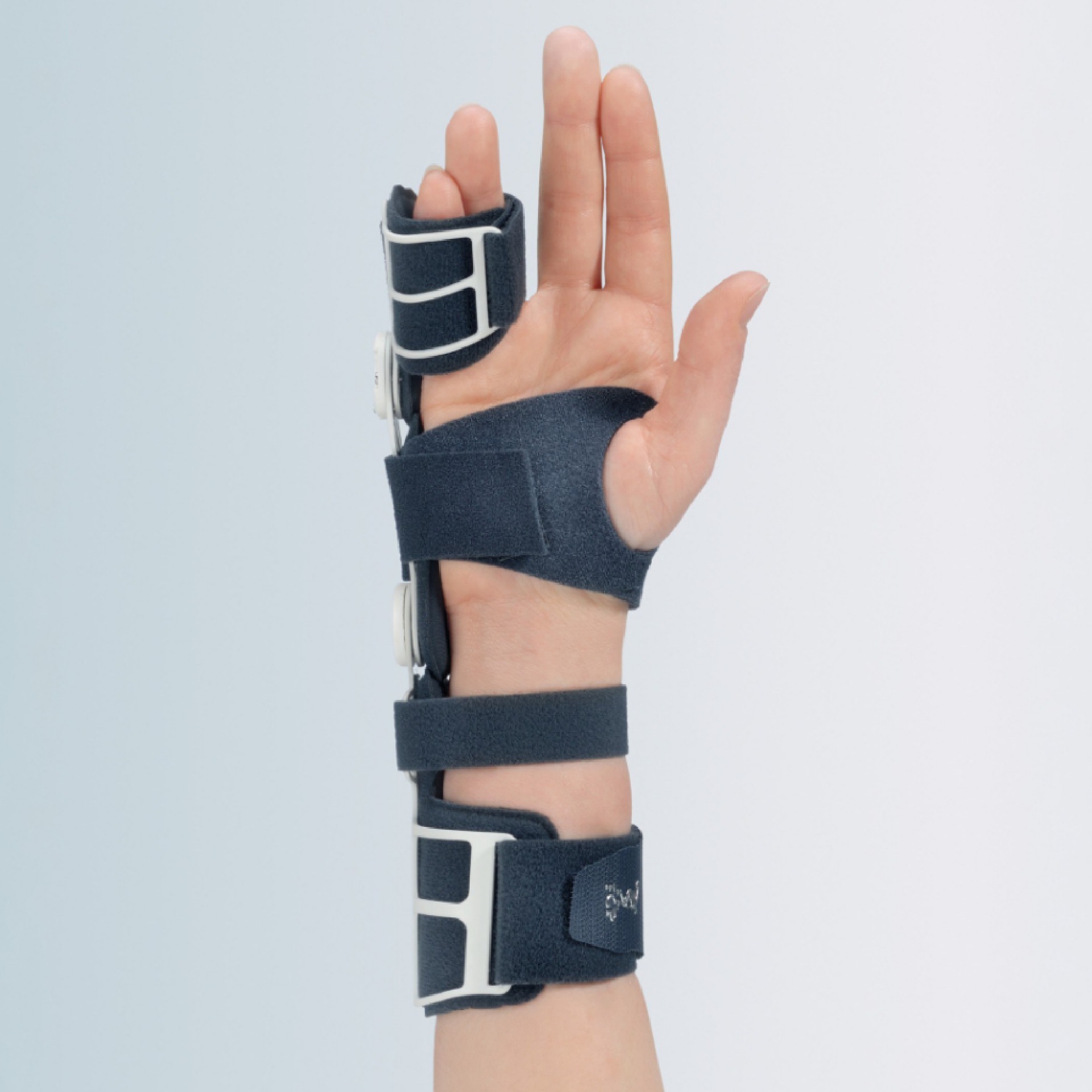 Tutore modulabile per 4°-5° dito della mano. Struttura laterale in alluminio modellabile, possibilità di regolazione del ROM dell’articolazione del polso e metacarpo falangea.