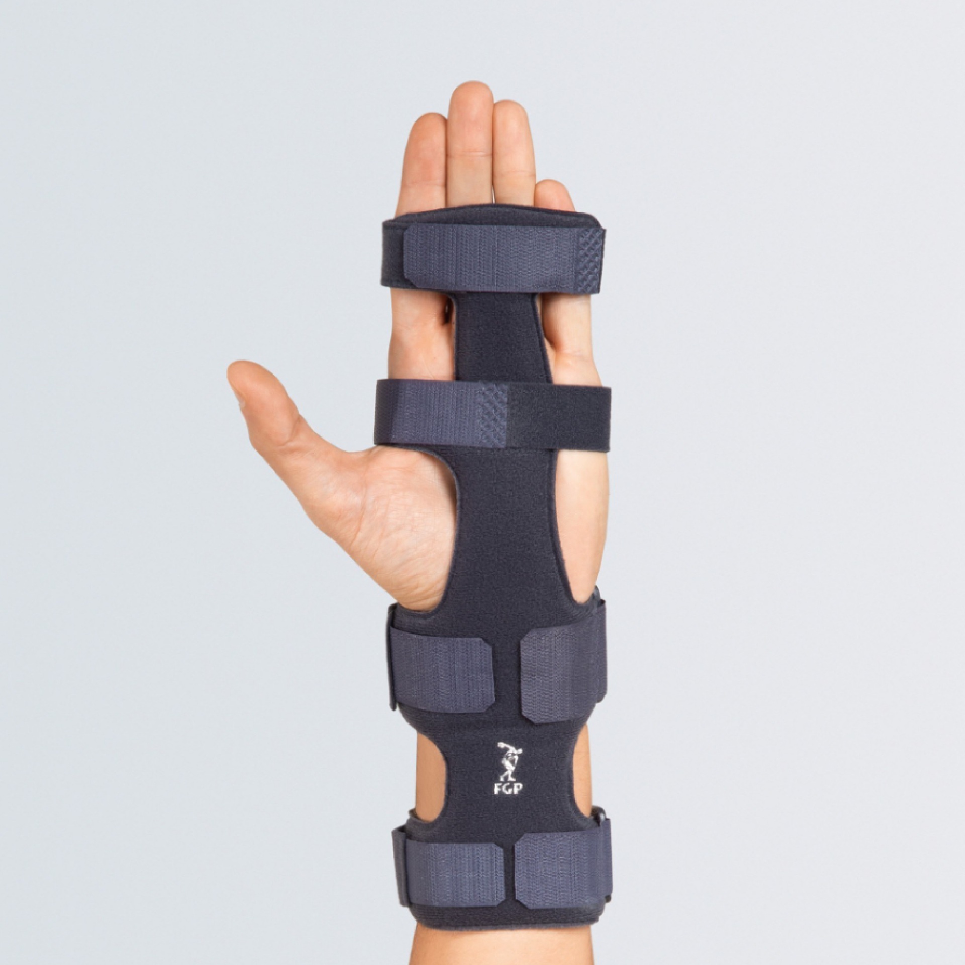 Tutore per tunnel carpale con steccatura in alluminio modellabile con prolungamento sulle dita della mano.
