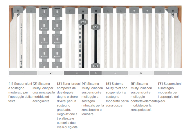 Sostegno a zone differenziate: Multy Point nella zona spalle e Doghe in faggio.