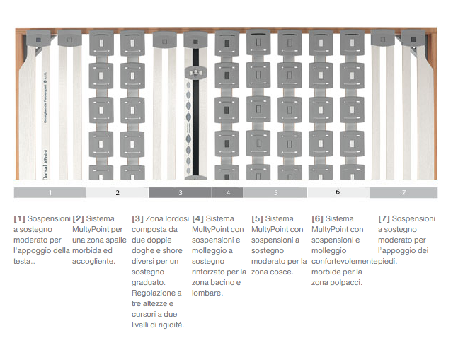 La complessa struttura di XPoint 400 è composta da elementi tridimensionali Multy Point distribuiti rispettando le fisiologiche caratteristiche della struttura vertebrale grazie anche alla speciale suddivisione del supporto in zone differenziate. Gli elementi tridimensionali Multy Point a supporto differenziato accolgono zona spalle, bacino, cosce e polpacci, le doghe sono riservate alla zona testa, lordosi e piedi. Le doghe sono il cuore del supporto e sono realizzate in faggio multistrato. Le doghe sono altamente performanti grazie ai 7 strati che rendono il molleggio uniformemente flessibile e resistente, respingono l’umidità grazie alla pellicola che le ricopre e le protegge, mentre la struttura a piccole depressioni crea benefici passaggi d’aria tra doga e materasso per una costante aerazione. Queste doghe rendono il supporto particolarmente indicato per chi dorme sul fianco e ricerca un sostegno bilanciato della zona del bacino. Questa tecnologia combinata, lavorando in perfetta sinergia con il materasso, consente il completo rilassamento muscolare riducendo i cambi posturali notturni e favorendo un’elevata qualità del riposo.